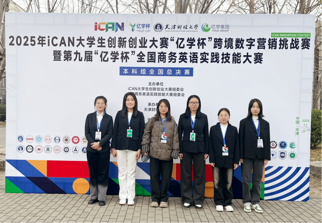 11月29日,2025年iCAN大学生创新创业大赛“亿学杯”跨境数字营销挑战赛全国总决赛在天津财经大学圆满落幕。由我校外语系陈新老师指导,商务英语专业学生申鑫南、舒君娜、胡洋、杨嘉怡、张婧芸五位同学组成的参赛团队,经过多轮角逐,最终荣获全国三等奖。