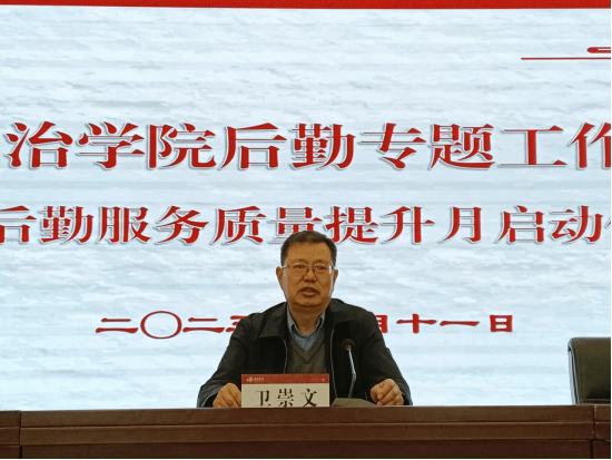 3月11日下午,我校在1号楼一号会议室召开后勤专题工作会暨“后勤服务质量提升月”启动仪式。校党委委员、副校长卫崇文出席会议,全体后勤员工及下属服务公司管理人员参加。会议由后勤部负责人主持。