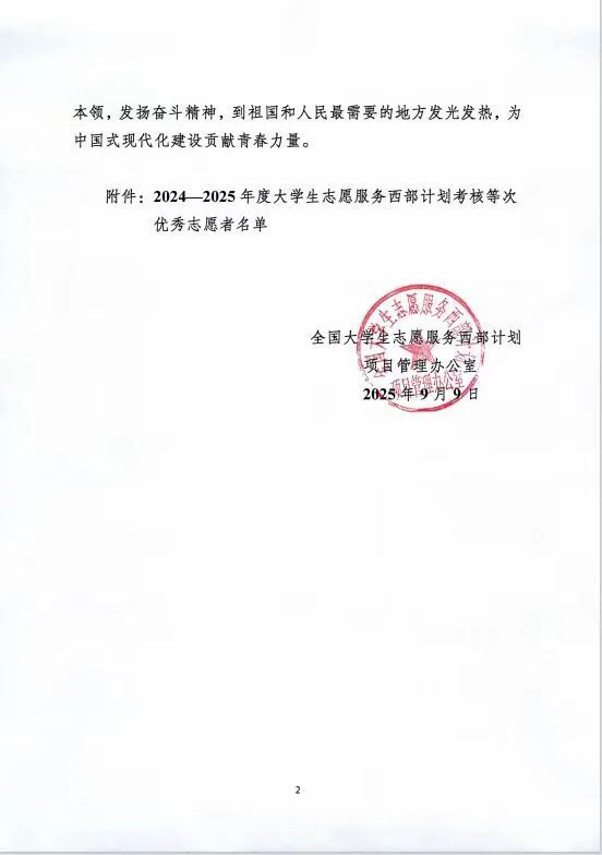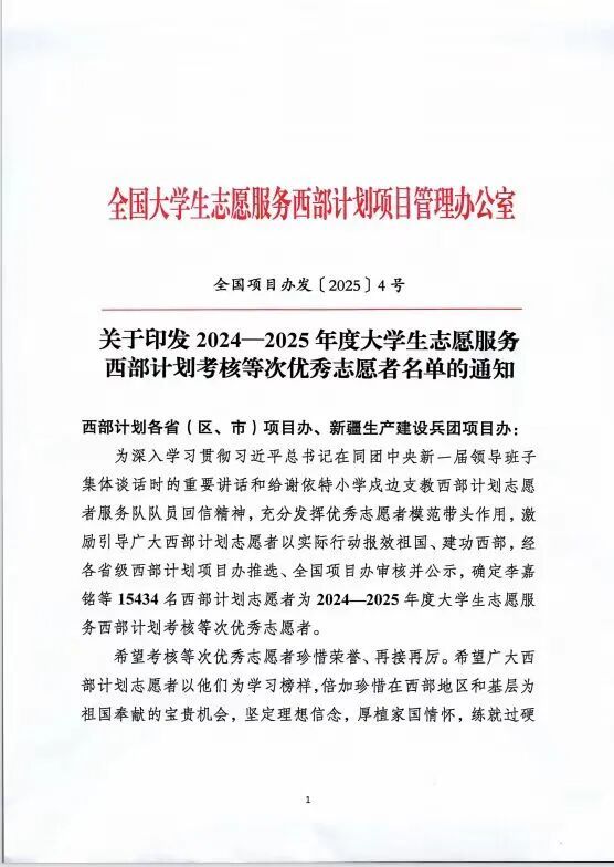 近日,全国大学生志愿服务西部计划项目管理办公室印发了《关于印发2024—2025年度大学生志愿服务西部计划考核等次优秀志愿者名单的通知》,我校陈俊宇、郭泽翔、孙嘉文、王沛源、白瑞帆、张秀明、赵斌、武羽茜、李鹏、左旭龙、宫艳、李雅欣、任家骅、赵齐娇、郭琦、吴涛、惠京飞、刘雅楠、张瑜、马普等20名西部计划志愿者在2024-2025年度大学生志愿服务西部计划志愿者考核中获评优秀等次。这份荣誉既是对他们个人服务成效的高度认可,更是学校践行立德树人根本任务、培育新时代青年担当精神的生动体现。