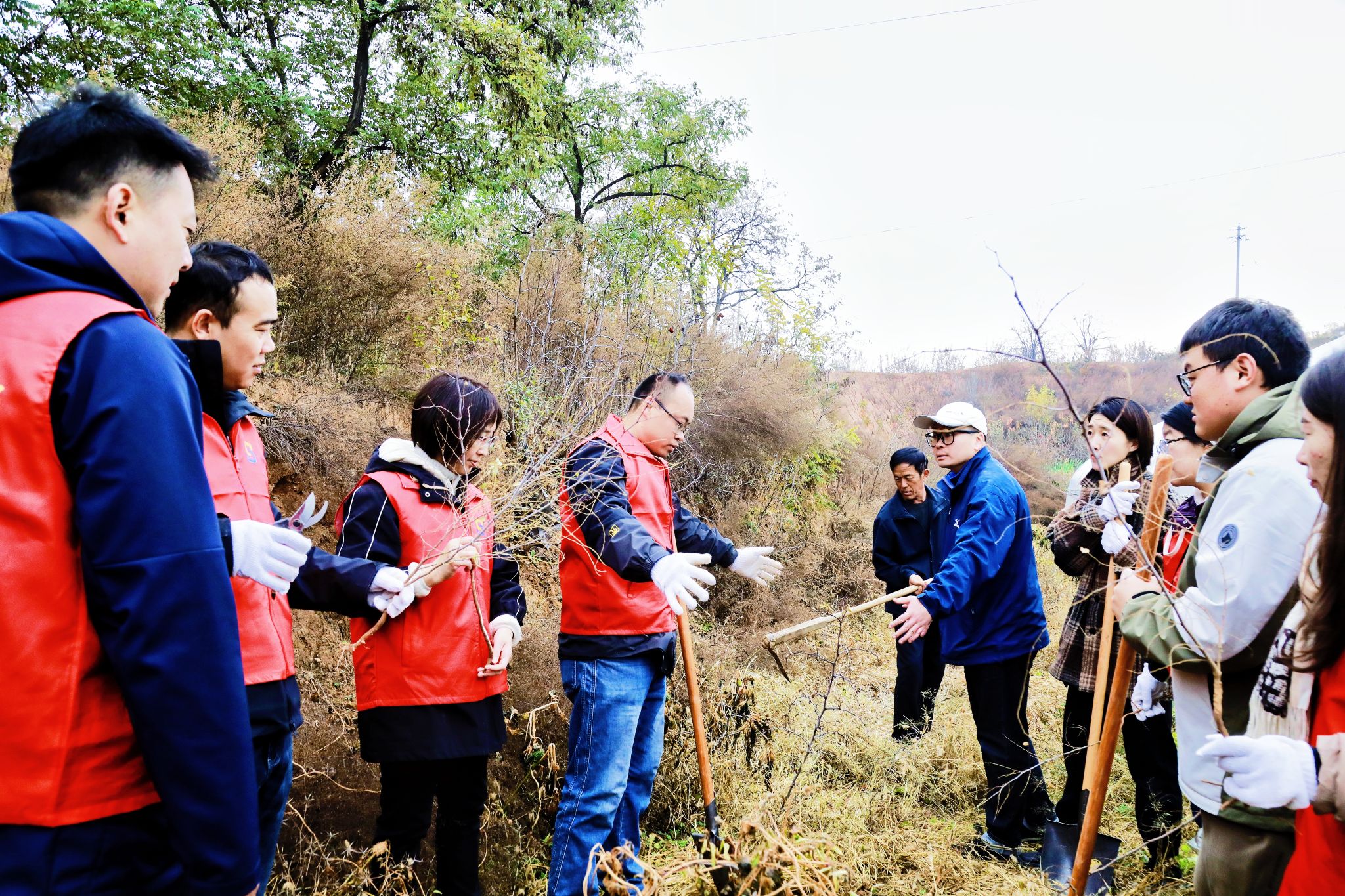 在理论培训结束后,我校教师深入田间地头,与农户们一同进行酸枣树移栽的现场实操。大家亲手示范,耐心指导,针对不同地块、不同苗情进行“把脉问诊”,提供个性化的管护建议,确保了技术指导的实效性。现场互动频繁,气氛热烈,专家现场教、农户动手学。