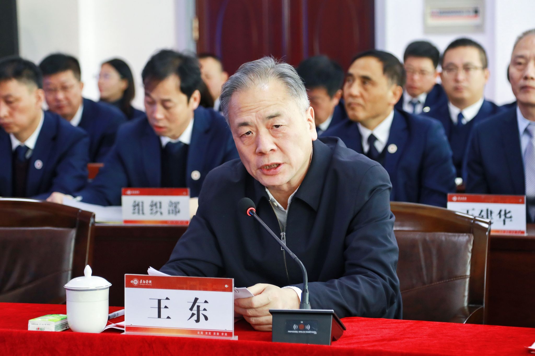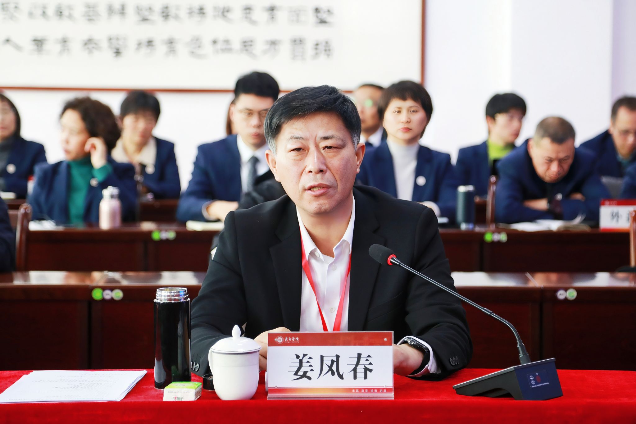 党委书记曹景川代表学校作表态发言。他代表学校全体师生,向专家组和一直以来关心支持学校发展的省教育厅和市委市政府表示诚挚感谢。他表示,学校将以高度的政治觉悟和行动自觉抓好审核评估整改工作。一是聚焦立德树人,构筑高质量育人体系。对照审核评估“五个度”标准,以太行精神培根铸魂,不断完善“三全育人”“五育并举”育人体系。二是聚力整改攻坚,筑牢可持续办学根基。对照专家组反馈意见,系统梳理短板弱项,制定整改方案,真正把审核评估结果转化为夯实办学根基、提升育人质量的扎实行动。三是聚势内涵改革,激发创新发展动力。坚持OBE教育理念,持续深化课堂教学改革,深入构建“产教融合、科教融汇”的育人新生态,切实将审核评估要求转化为深化改革、提升质量的强劲内生动力。
