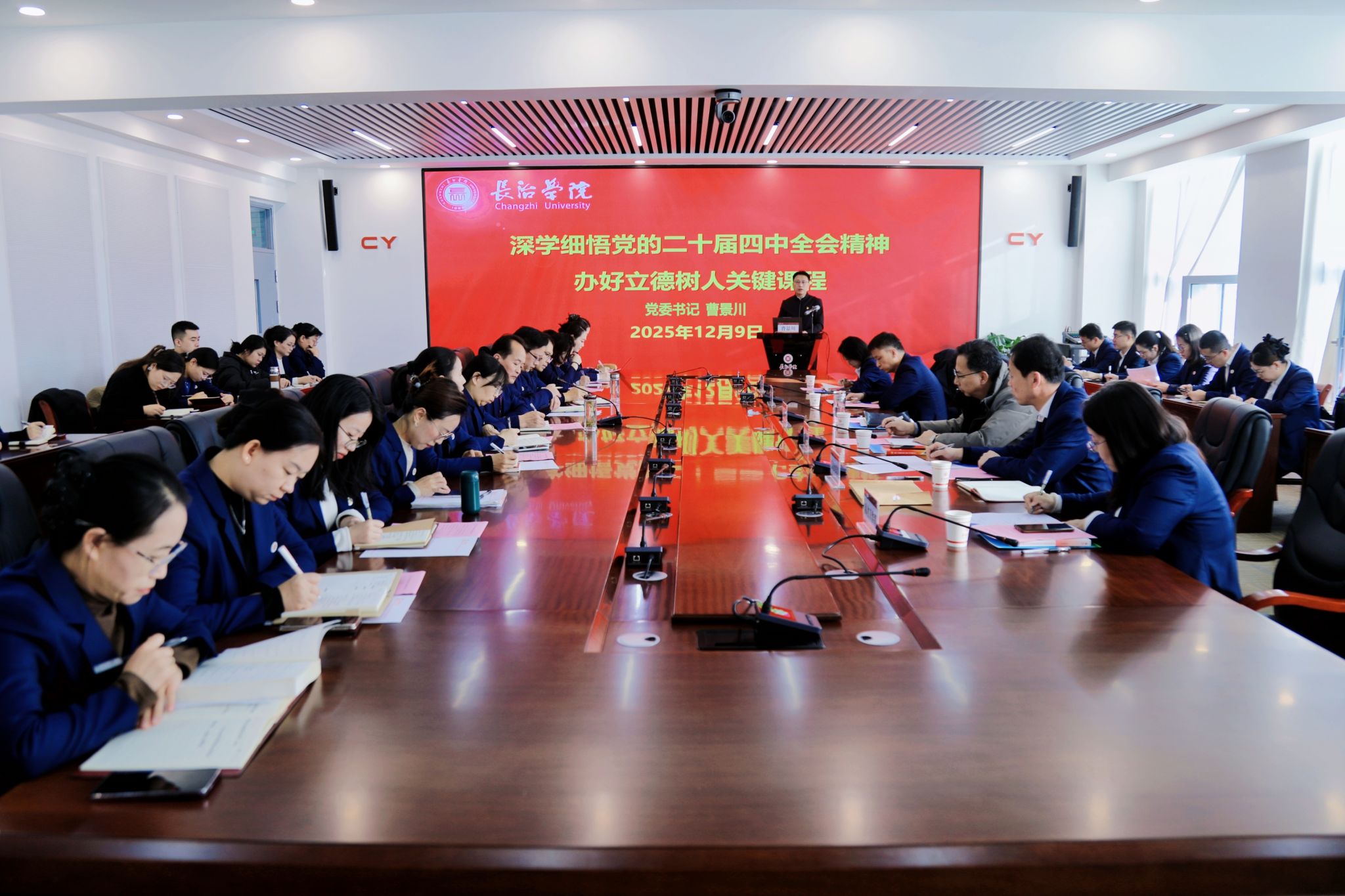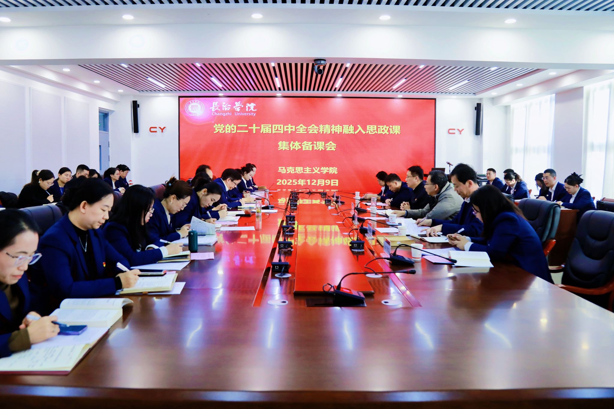 为深入学习领会、全面准确把握党的二十届四中全会精神,引导师生把思想和行动统一到党中央决策部署上来,12月9日下午,党委书记曹景川到马克思主义学院,以《深学细悟党的二十届四中全会精神 办好立德树人关键课程》为题作宣讲报告,进一步推动全会精神在基层走深走实,为学校谋划“十五五”良好开局凝聚力量。宣讲结束后,曹景川参加了党的二十届四中全会精神融入思政课集体备课会。党委副书记史晓东,马克思主义学院全体教师和党委办公室、党委组织部、党委宣传部、人才工作部负责人参加。