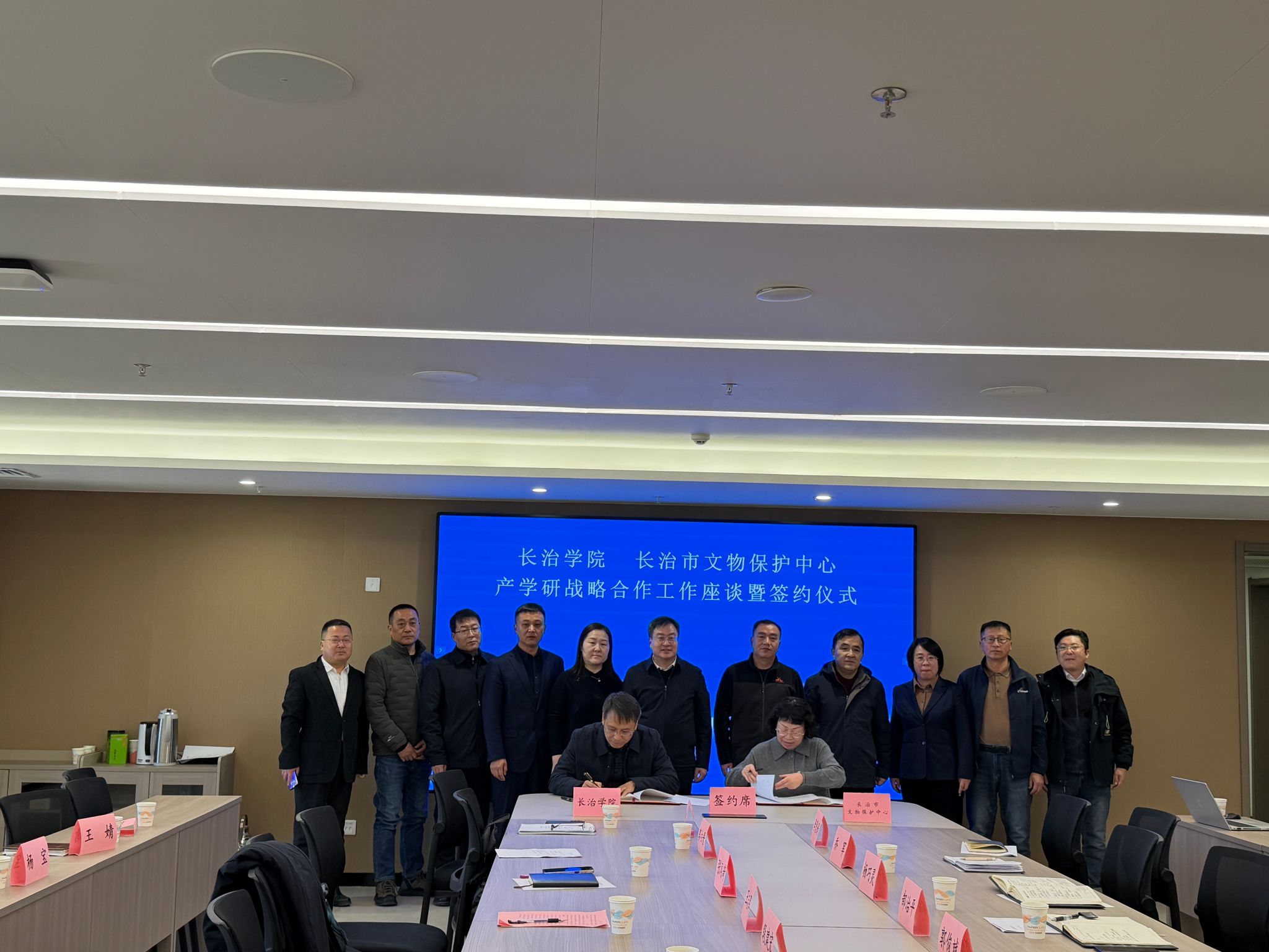 1月15日,我校与长治市文物保护中心产学研战略合作工作座谈暨签约仪式在长治市文保中心大会议室举行。校党委委员、副校长王志军出席活动。长治市文保中心主任郜治平、副主任杨巧灵、郭俊斌及相关科室负责人,与我校科研部、就业创业指导中心、历史与旅游管理系教师代表共同参加会议。