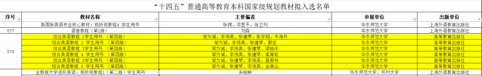 近日,教育部公布“十四五”普通高等教育本科国家级规划教材拟入选名单,我校外语系教师李伟英、郭佳、闫美荣、张慧智、田东婷作为主要编写人员,参与编写的《综合英语教程(第4版)》(全套6册)教材成功入选。