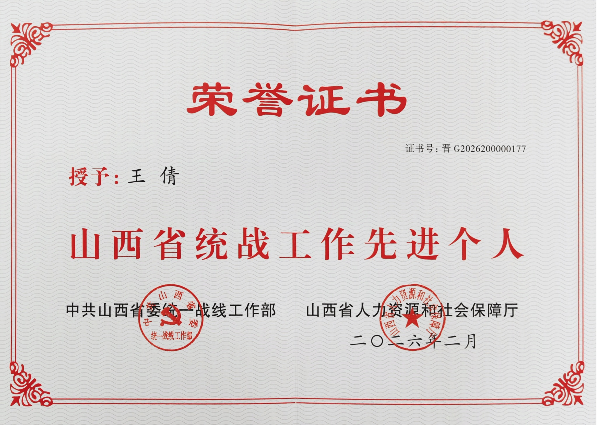 近日,山西省委统战部、山西省人力资源和社会保障厅发布表彰决定,授予一批在全省统一战线工作中表现突出的先进集体与个人荣誉称号。我校法律系党委副书记王倩光荣获评“山西省统战工作先进个人”。