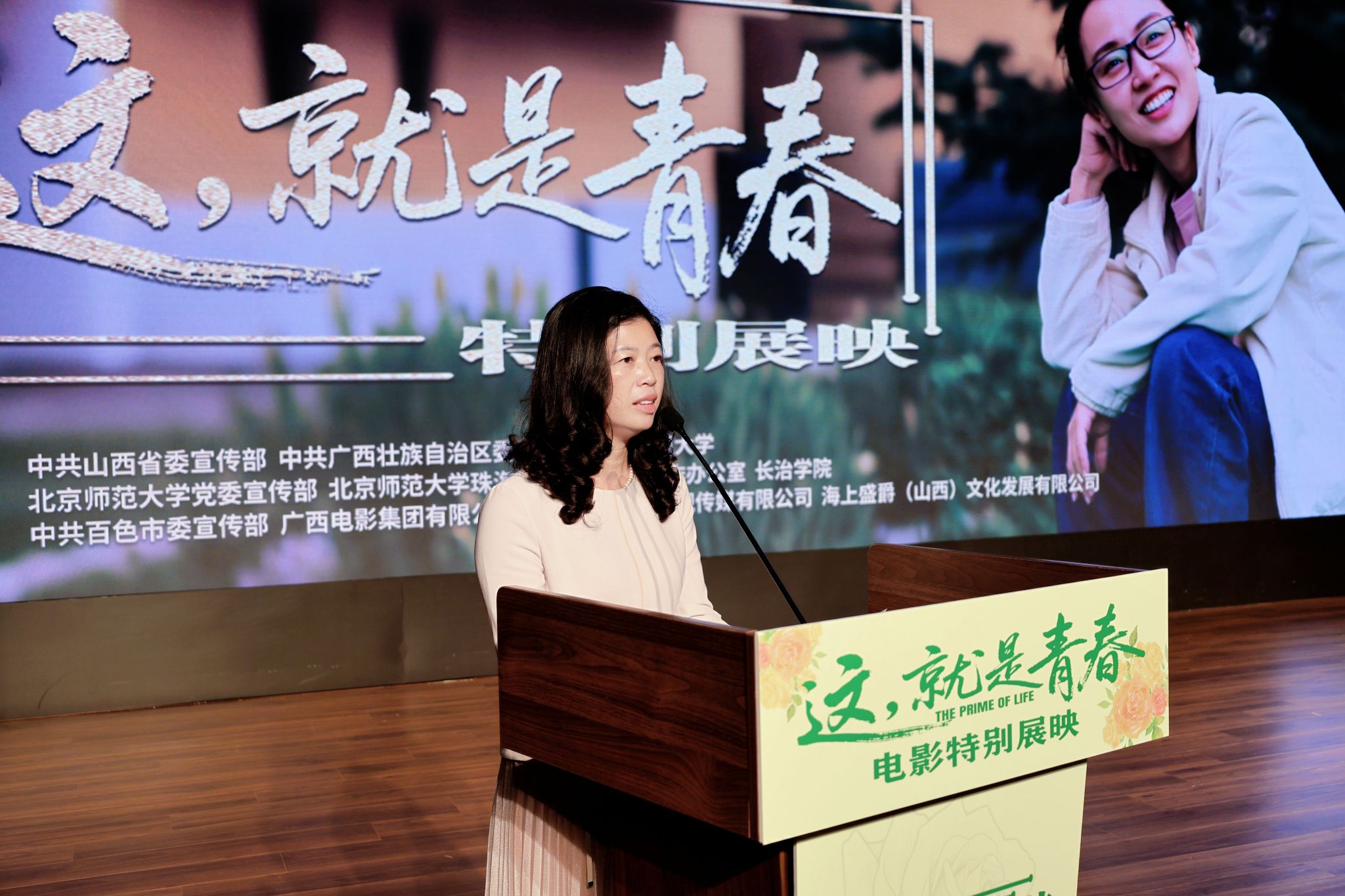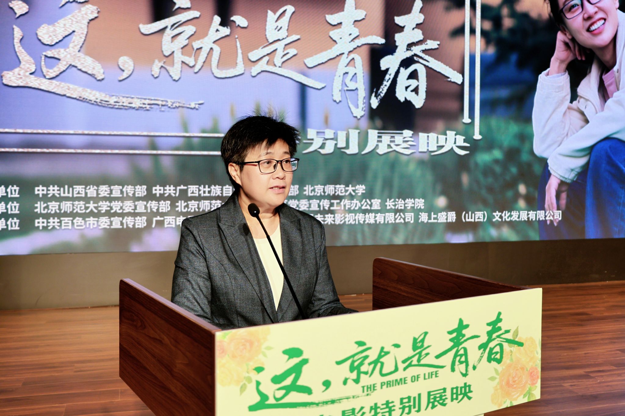 曹景川在致辞中表示,黄文秀是广西培养的优秀干部,是长治学院和北京师范大学的杰出校友代表。她的先进事迹感动了中国,也为三地留下宝贵精神财富。在清明节期间,联合举办《这,就是青春》特别展映活动,以集体观影的方式一起缅怀文秀、致敬文秀、学习文秀,希望以此为契机,进一步深化校校、校地思政教育交流协作,引导广大青年学子在文秀的故事中感悟信仰的力量,努力成长为堪当民族复兴重任的时代新人。
