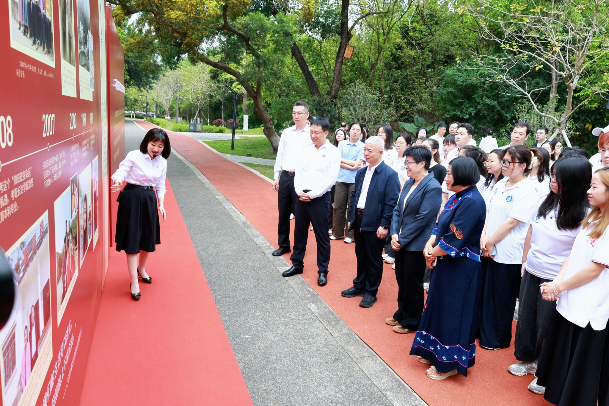 集体观影前,与会领导嘉宾、师生代表共同参观“谱写新时代的青春之歌——黄文秀先进事迹展”,并向黄文秀铜像敬献花篮。