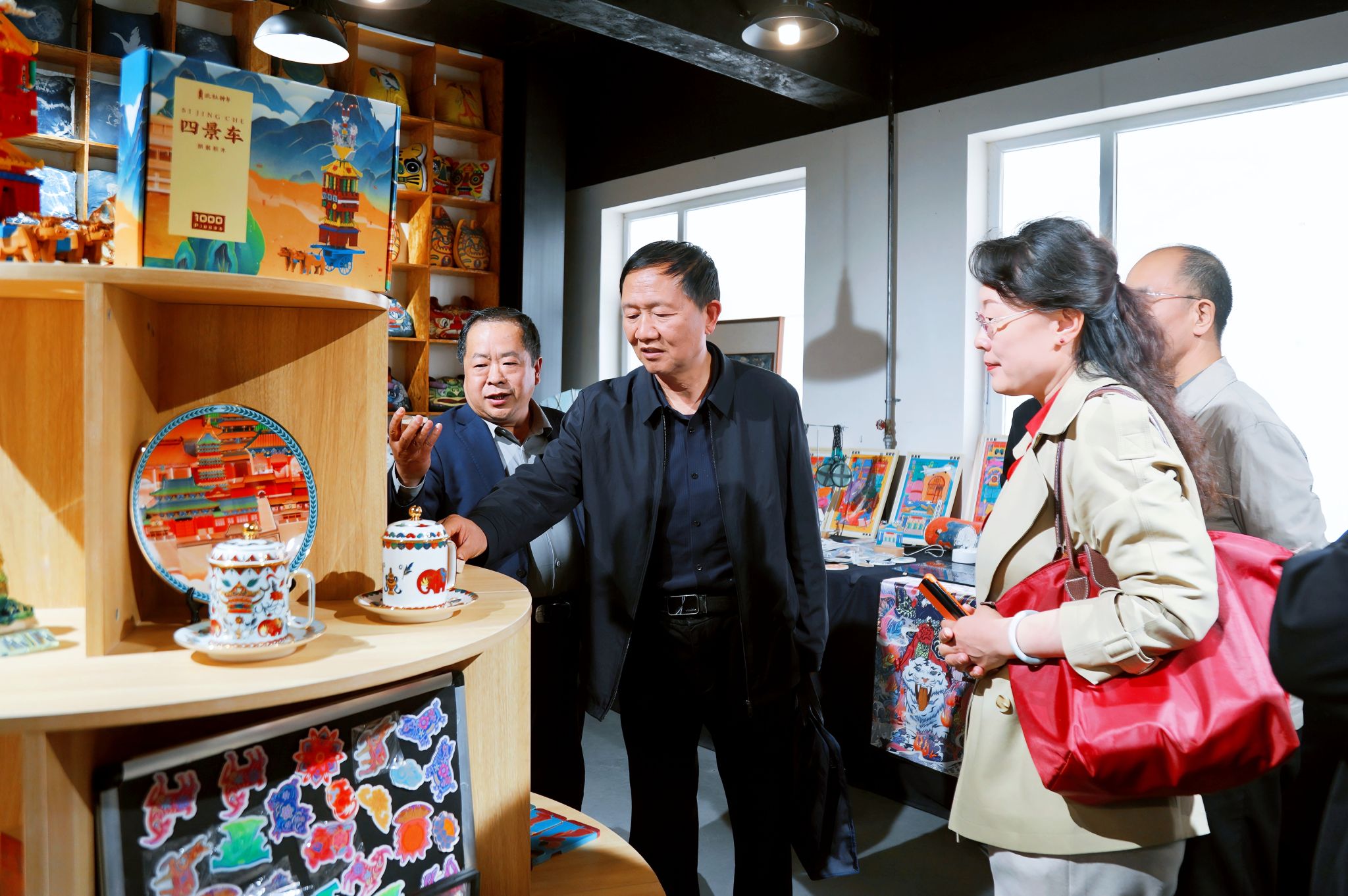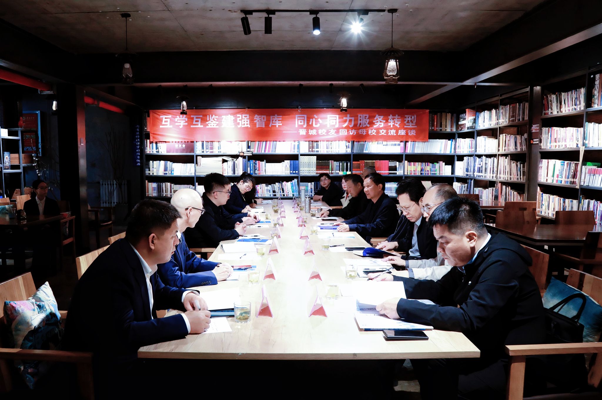 会见结束后,校友代表一行来到我校产教融合创新基地,了解学校特色文创产品,并与资源型城市高质量发展研究中心进行了座谈交流。会上,中心负责人介绍了研究中心的建设情况、研究方向及成果,重点阐述了在资源型城市产业升级与区域经济发展等方面的研究进展,表示期待与晋城校友加强合作,将科研成果转化为服务地方发展的实际效能,共同为两地高质量发展贡献力量。晋城校友郭向阳、焦勇、司进锋结合自身工作实践,先后介绍了晋城市经济社会发展概况、山西省专家学者协会太行智库建设情况以及晋城市发展研究中心近期研究成果。他们表示,将继续为推进长治、晋城两地智库交流和校地合作搭建桥梁纽带作用。